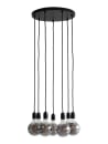 Flot klyngependel i enkel udførsel. Oplagt lampe til dekorationspærer (medfølger ikke ). Klyngependlen består af 7 fatningssæt i sort tekstilledning, som kan afkortes samt baldakin og samlingssæt i denne.